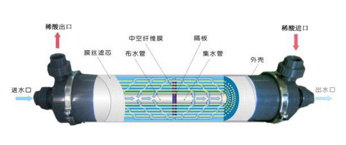 (一).膜法氨氣回收技術(shù):廢水中的氨氮在水中存在離解平衡,當(dāng)提升廢水的PH值時(shí),廢水中的氮氮即分解為氣態(tài)氨直至達(dá)到平衡。同時(shí)經(jīng)PH值提升的廢水進(jìn)入氨氮分離膜,氣態(tài)氨會(huì)透過(guò)疏水性中空纖維膜的微孔與膜外側(cè)的吸收液發(fā)生反應(yīng),由此又一次會(huì)分解廢水中的氨氮直到氣態(tài)氨達(dá)到平衡,即呂.查德里(A.L.LE Chatelier)原理:在自然界中一切平衡都是相對(duì)的與暫時(shí)的,一但改變平衡系統(tǒng)的條件之一,平衡就向參減弱這個(gè)改變的方向移動(dòng)。