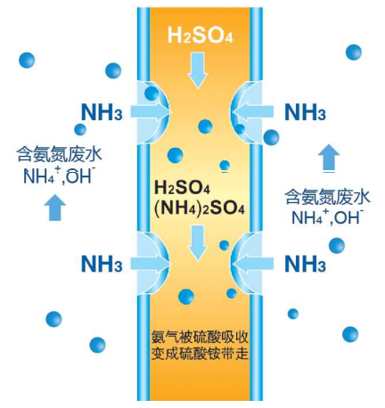 氨氮在水中存在以下離解平衡:NH 4 + +OH - NH 3 +H 2 O,廢水中PH提高或者溫度上升時,上述平衡將會向右移動,銨根離子NH 4 + 變成游離的氣態(tài)NH 3 。這時氣態(tài)NH 3 可以透過中空纖維表面的微孔從殼程中的廢水相進(jìn)入管程的酸吸收液相,被酸液吸收立刻又變成離子態(tài)的NH 4 + 。