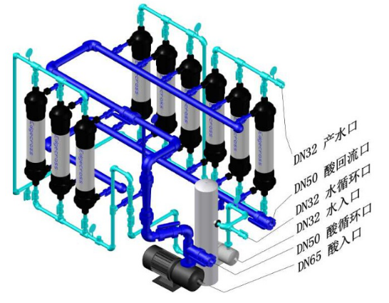 用途分類催化劑生產(chǎn)過程酸交換工序中會產(chǎn)生大量的高濃度NH3.N廢水,原先的NH3.N吹脫系統(tǒng)不僅能耗較大而且會有部分NH3排入大氣中造成大氣污染,從節(jié)約能源、低碳、循環(huán)利用以及降低后續(xù)的污水處理角度出發(fā)本項目引進(jìn)了國外利用膜接觸器去除水中的NH4+ 并且回收利用一項新的應(yīng)用技術(shù)。